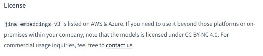 Caveat: the jina-embeddings-v3 model is available on Hugging Face (and likely in other repos), but it’s licensed under CC BY-NC 4.0 (Creative Commons Attribution–NonCommercial 4.0).