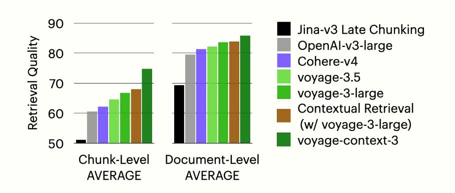Contextualized embeddings push things further still. Instead of engineering tricks, models like voyage-context-3 are trained to “bake in” global context, delivering stronger results out of the box.